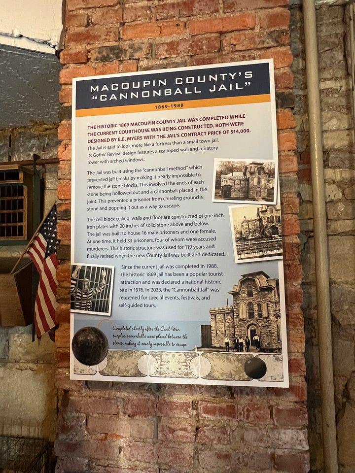 Built in 1869 a few years after the end of the Civil War, the Macoupin County Jail was constructed using the “cannonball method” which prevented jail breaks “by making it nearly impossible to remove the stone blocks,” a jail poster says.