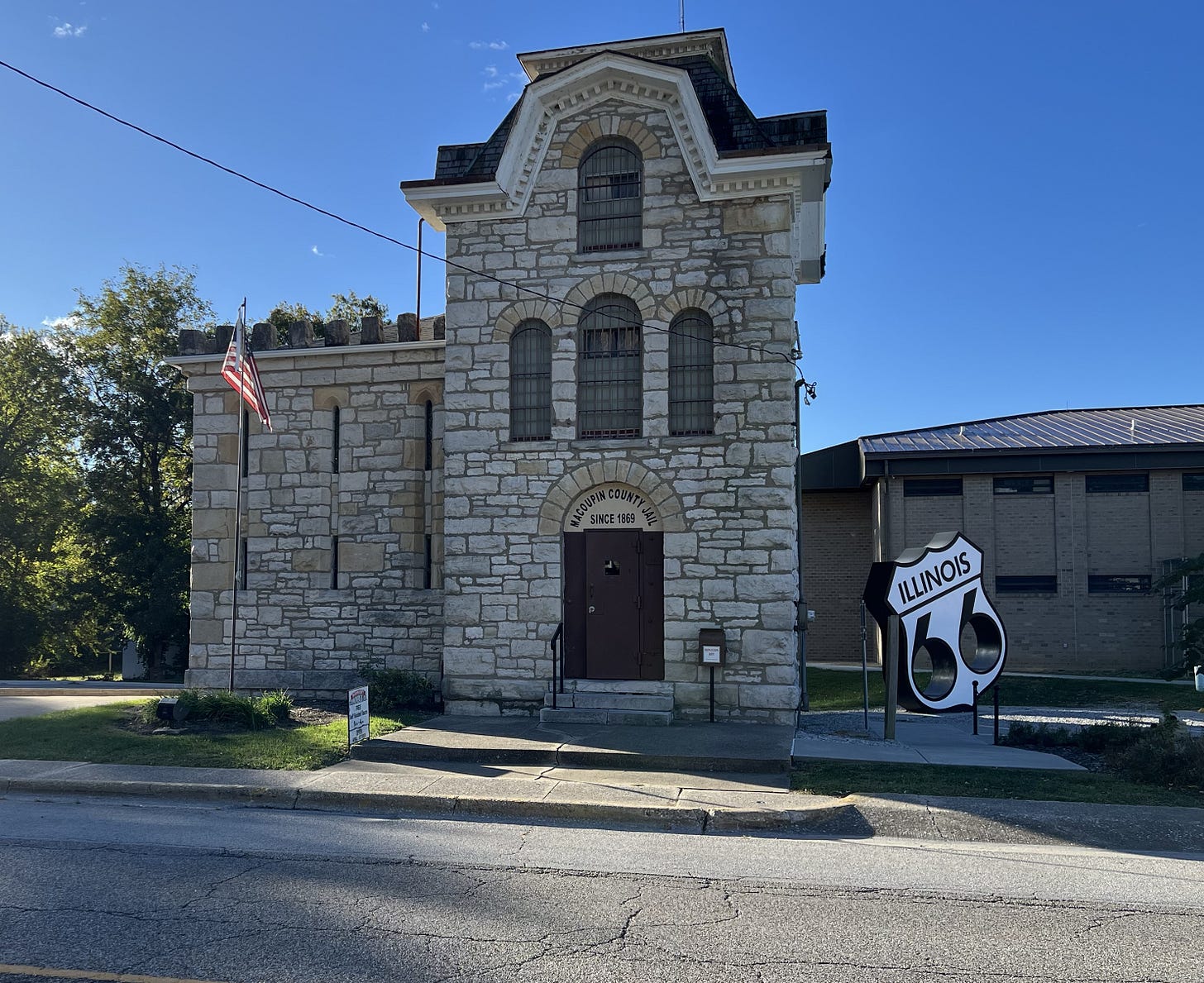 “The years which Route 66 traveled through Macoupin County coincided with the end of the Prohibition Era,” a jail sign says. “There was a lot of bootlegging in the county which was recorded in the jail records. The arrests included possessing and operating a still along with selling and transporting intoxicating liquor.”